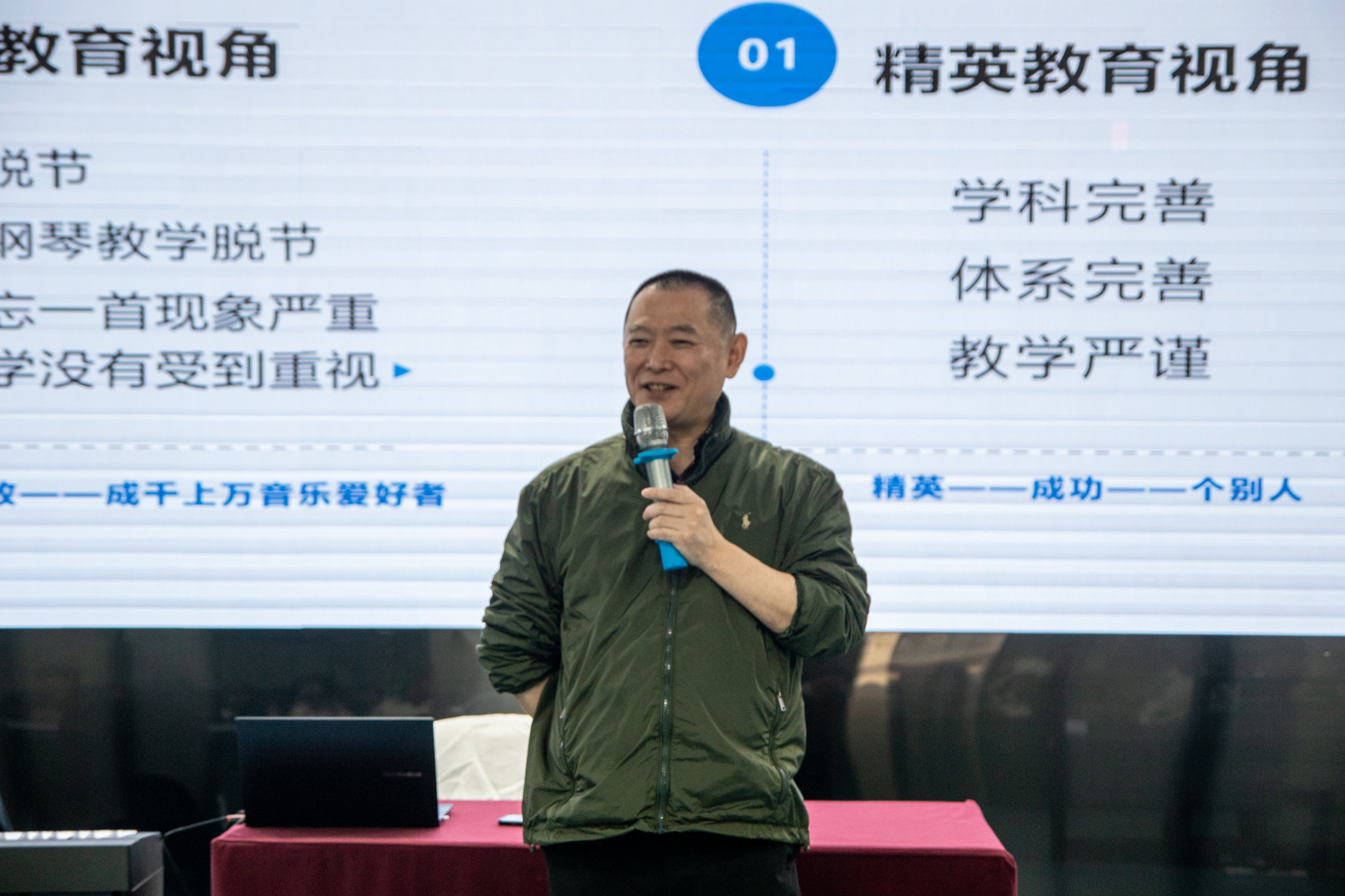 授聘仪式后,辛笛教授围绕三大核心主题展开专题分享。针对当前音乐教育现状,他从行业发展趋势切入,深入剖析钢琴教育从“技艺培养”向“综合素养塑造”的转型逻辑,强调应用钢琴教学在素质教育中的独特价值。