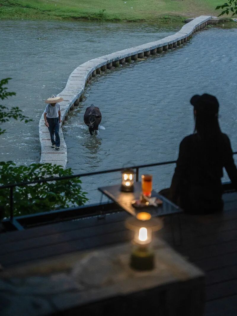 教师团队随后前往民宿几分钟路程之外的朵咩咖啡进行参观体验。朵咩咖啡在匠庐民宿坐落在雷屯村太极沙洲旁,距匠庐·耕读第民宿几分钟步行路程。咖啡馆不仅有常见的美式拿铁等经典咖啡,也有结合贵州特色食材和水果的特调咖啡,远道而来的客人能够在乡野之间也品尝到美味的现磨咖啡。在咖啡馆的落地窗或外摆区,太极沙洲的美景一览无余,“金洲银滩”风光毓秀,绿洲、浅滩、流水、跳石交织成画,浅滩处悠闲吃草的水牛和马匹,以和草地旁露营、戏水的人们共同构成了一副美丽乡村的景象。