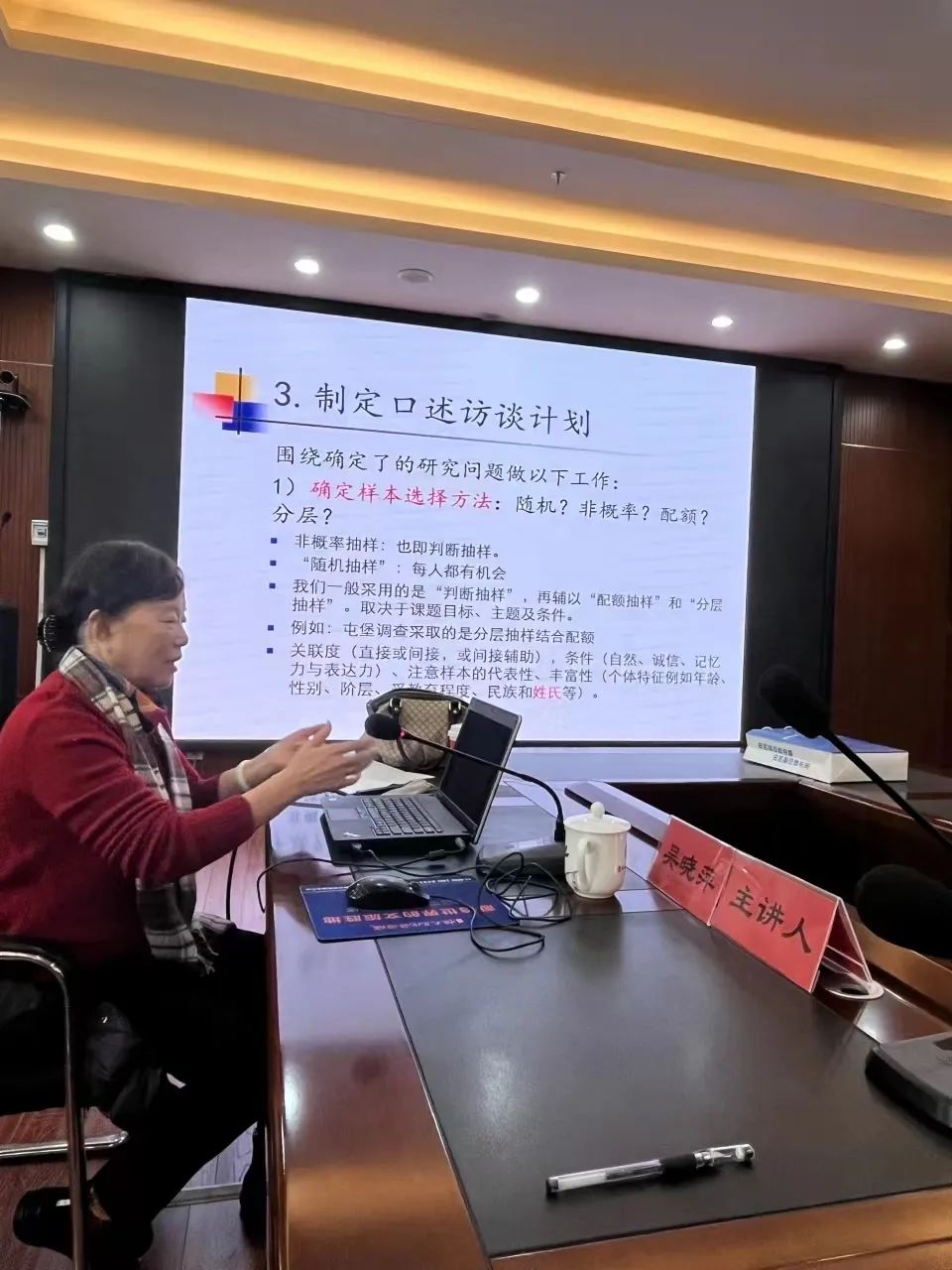 培训分为理论和操作两部分。理论部分,吴晓萍教授基于自身扎实的理论功底及深厚研究基础,向参训师生深入浅出地阐述了社会调查的基本理论,强调其对科学研究的重要作用。在访谈操作部分,吴教授结合自身开展社会调查的实际经验,详细讲解了社会调查前期准备、口述访谈及资料整理等三个阶段的操作方法。尤其是重点讲述了什么是口述史,口述史方法与访谈法的区别,如何确定选题并有针对性地制定访谈提纲,以及开展口述访谈如何进行文本转录与编辑处理等。