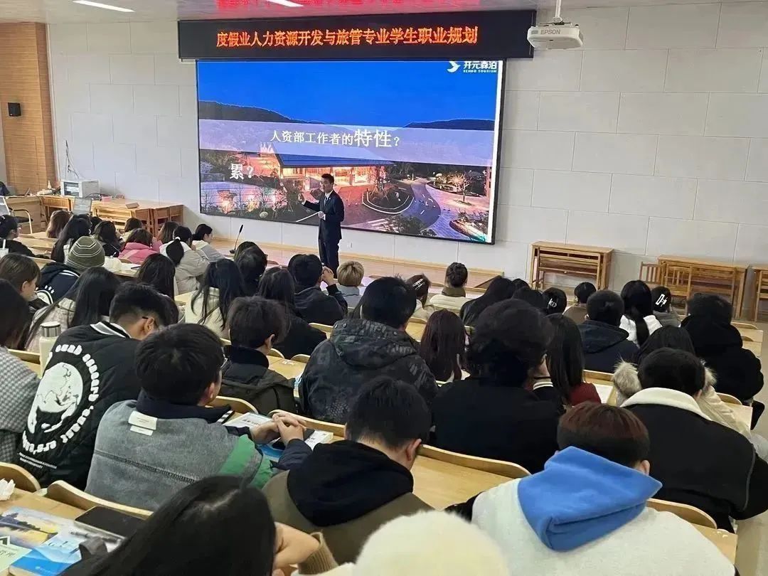 11月14日下午,我院邀请开元森泊管理公司招聘总监单磊及招聘经理吴燕,分别为我院2022级和2023级旅游管理专业学生讲授了非常精彩的专业认知及职业生涯规划课。
