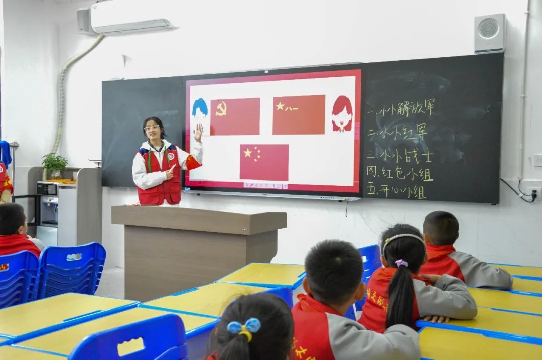 在红色文化课堂上,团队成员以阅兵仪式视频为切入点,生动展现中国人民解放军的辉煌历程,讲解军旗的深刻内涵。通过“传数破障”“拼图忆昌”等互动环节,学生们沉浸式体验南昌起义的历史风云。现场问答时,学生踊跃抢答,展现出对革命知识浓厚的学习兴趣。随后,全体师生齐声朗诵《八一军旗诵》向革命先烈致以崇高敬意。活动在《中国少年先锋队队歌》激昂的旋律中落下帷幕,激励每位参与者铭记光辉历史,矢志不渝传承红色基因,弘扬革命精神。