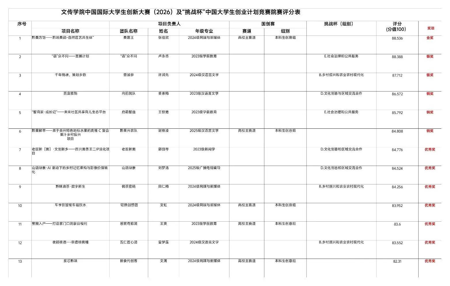 本次竞赛成员来自汉语言、新闻与传播、英语、学前教育等多个专业,项目涉及语言教育推广、非遗文化创新传播、农文旅融合发展、少数民族音乐数字化传承等方向,各参赛团队通过路演与答辩,全方位展示我院在文化创意、乡村振兴、社会治理等领域的实践成果。经过激烈角逐与严格评审,最终评选出金奖1项、银奖2项、铜奖4项及若干优秀奖。