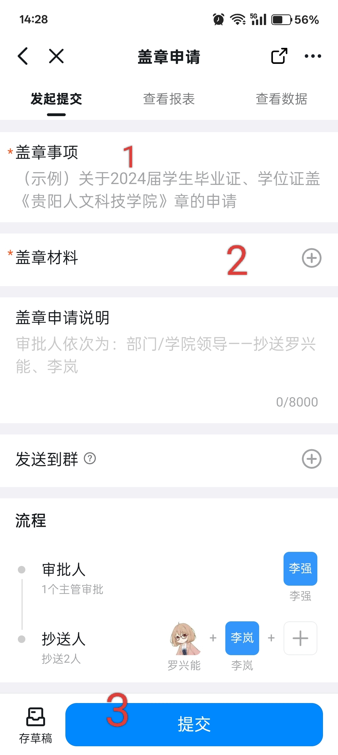 3按顺修填写盖章申请事项相关信息,确认点击提交。