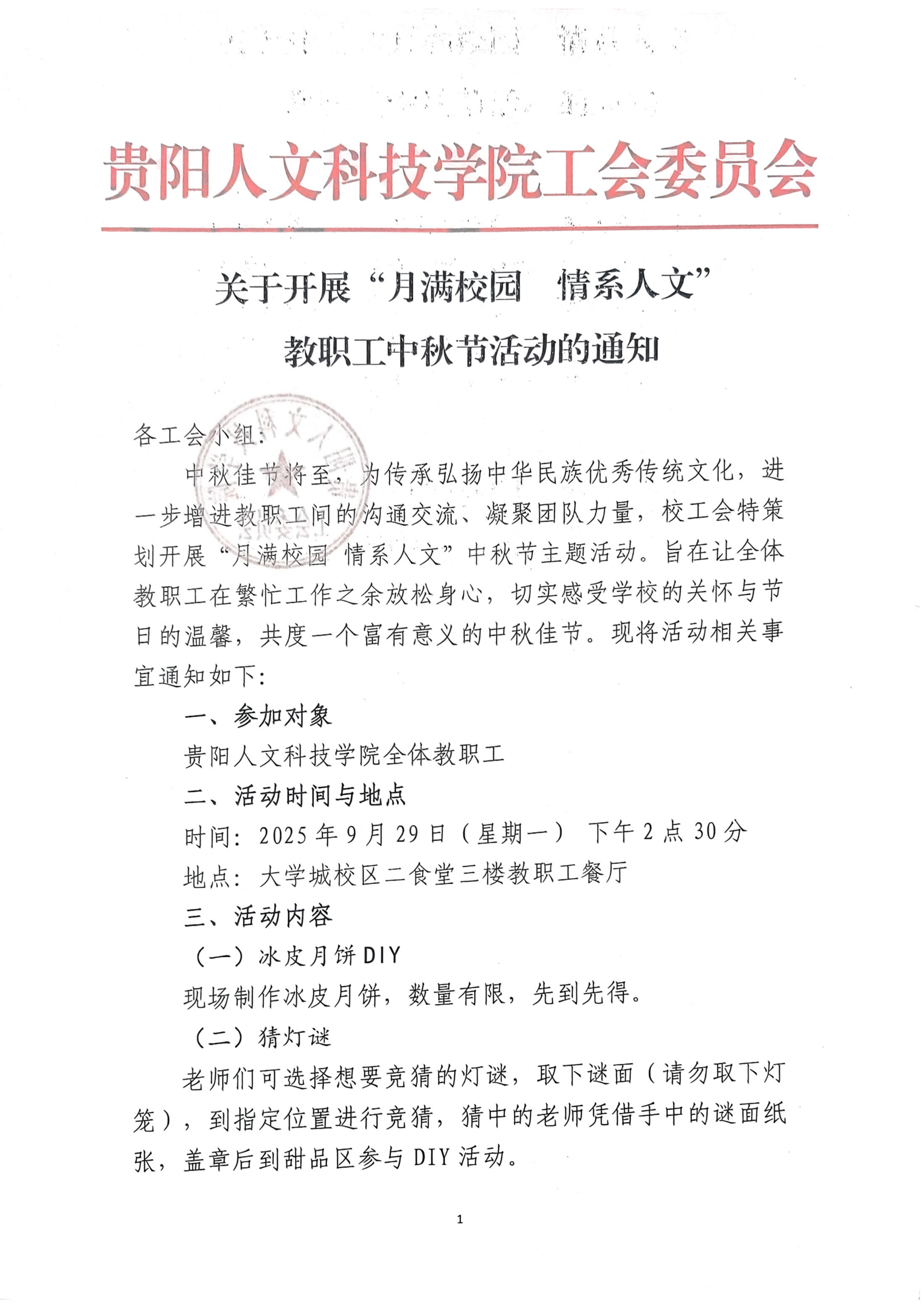 关于开展“月满校园 情系人文” 教职工中秋节活动的通知