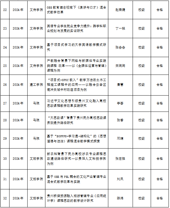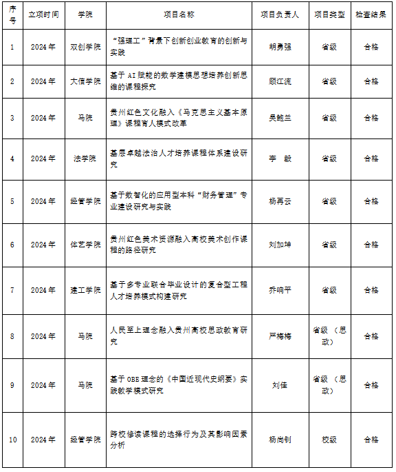 根据人文教字2025【91】《关于开展2025年度本科教学内容和课程体系改革项目中期检查的通知》要求,教务处组织专家对2024年立项的省级、校级教改项目进行中期检查。经专家审查材料、学校领导审定最终检查结果,现将本次中期检查结果进行公示,公示期为2025年11月25日至11月27日(共3个工作日)。如对检查结果有异议,请在公示期内向教务处反映。