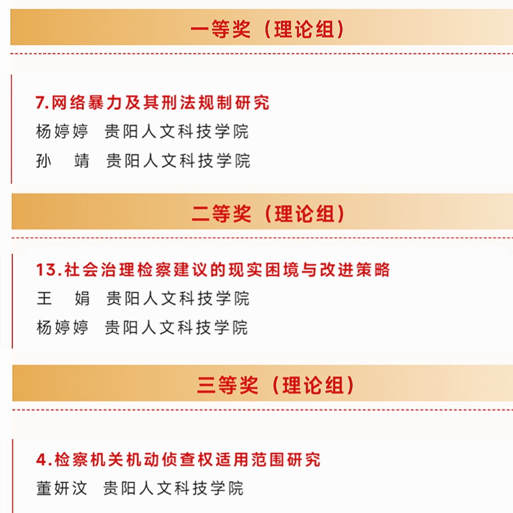 近日,北京市犯罪学研究会、贵州省法学会犯罪学研究会、贵州民族大学法学院、重庆邮电大学网络空间安全与信息法学院、威宁自治县人民检察院联合发布的第一届司法现代化主题征文获奖公告中,beat365杨婷婷、孙靖的参赛作品《网络暴力及其刑法规制研究》荣获(理论组)一等奖;王娟、杨婷婷的参赛作品《社会治理检查建议的现实困境与改进策略》荣获(理论组)二等奖;董妍汶的参赛作品《检查机关机动侦察权适用范围研究》荣获(理论组)三等奖。