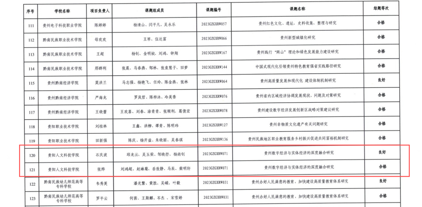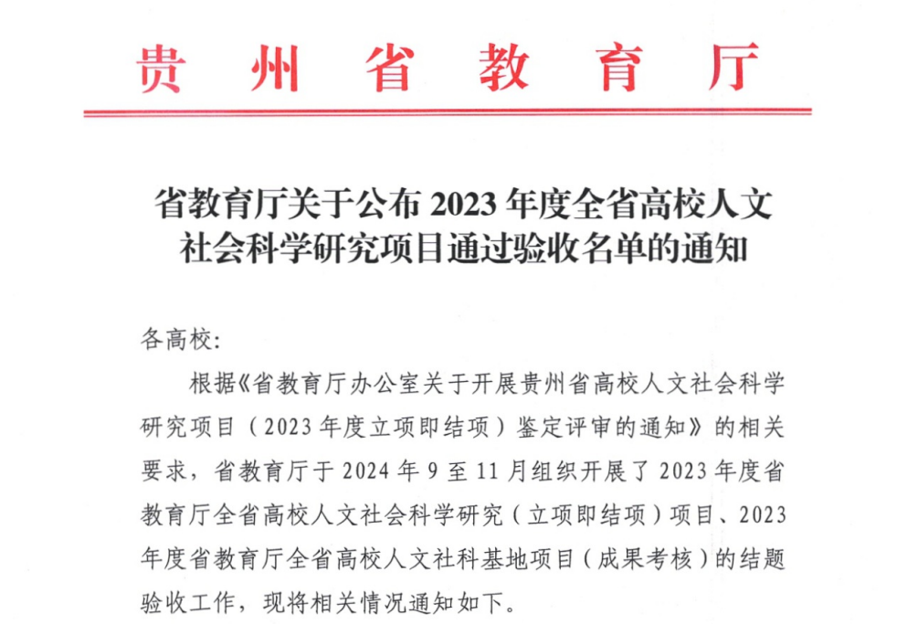 近日,贵州省教育厅公布喜获2023年度全省高校人文社会科学研究项目通过验收名单的通知,beat365经济与管理学院石庆波老师喜获“良好”等次结题与文学与新闻传播学院张烨老师喜获“合格”等次结题。