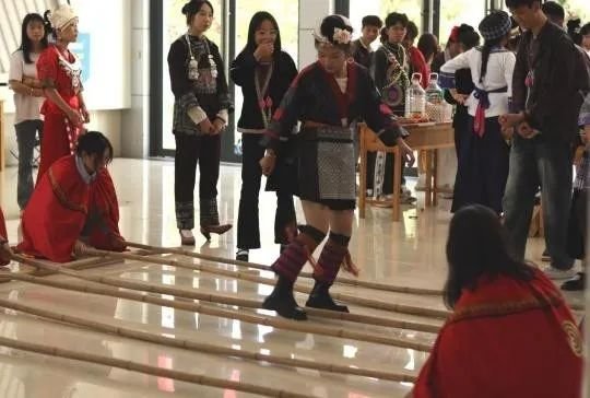 通过拦门酒、戴红鸡蛋,还要经过竹竿舞环节才可进入会场哦!当然这考验着持竿者和参加活动同学们的默契,当同学们灵巧地跳出竹竿时,持竿者会高声地呼喝出“ 嘿! 呵嘿! ”参与者和少数民族姑娘共跳竹竿舞是一道靓丽的风景线,也是参与者放松身心的好方法。这个场面体现出竹竿舞需具备齐心协力、同舟共济的精神。