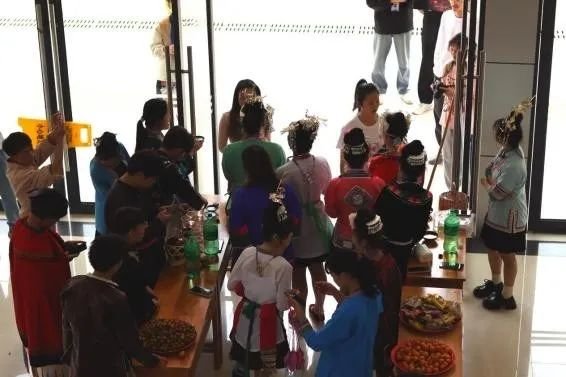 这是少数民族人们独特的欢迎远方客人的方式,如果事先知道了客人从远方而来,在很早的时候就会穿起盛装站在寨门口迎接远方客人,而客人到来要过的第一关就是拦门酒。拦门酒,表达着少数民族家人们的心诚,像酒一样浓烈,像山泉一样清纯。参加活动的老师、同学们,被苗哥阿妹拦在门口,举杯喝下拦门酒。