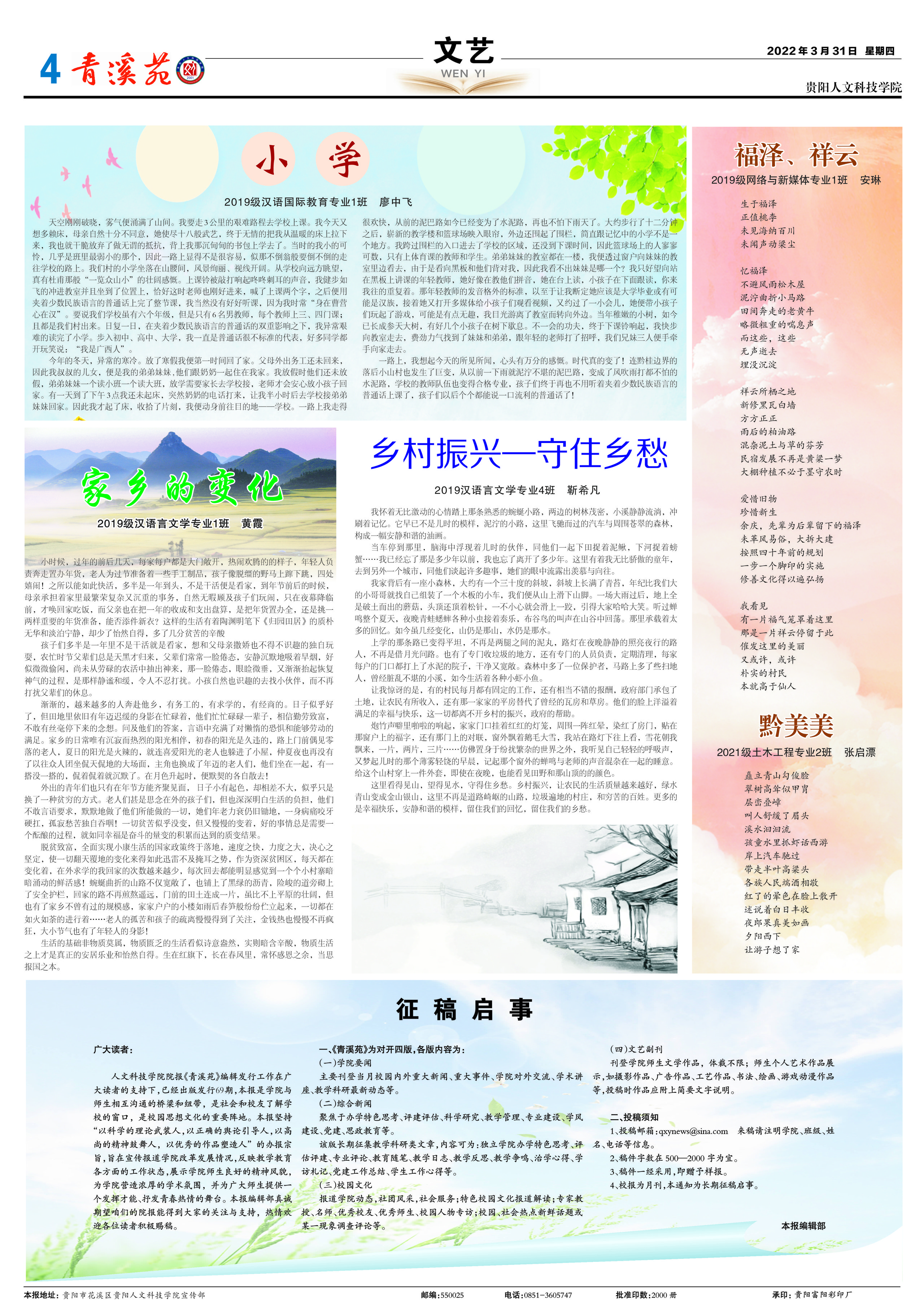 来稿请注明:学院、班级、姓名、电话等信息。稿件字数在500—4000字为宜,稿件一经采用,即赠予样报,校报为月刊,本报长期征稿。