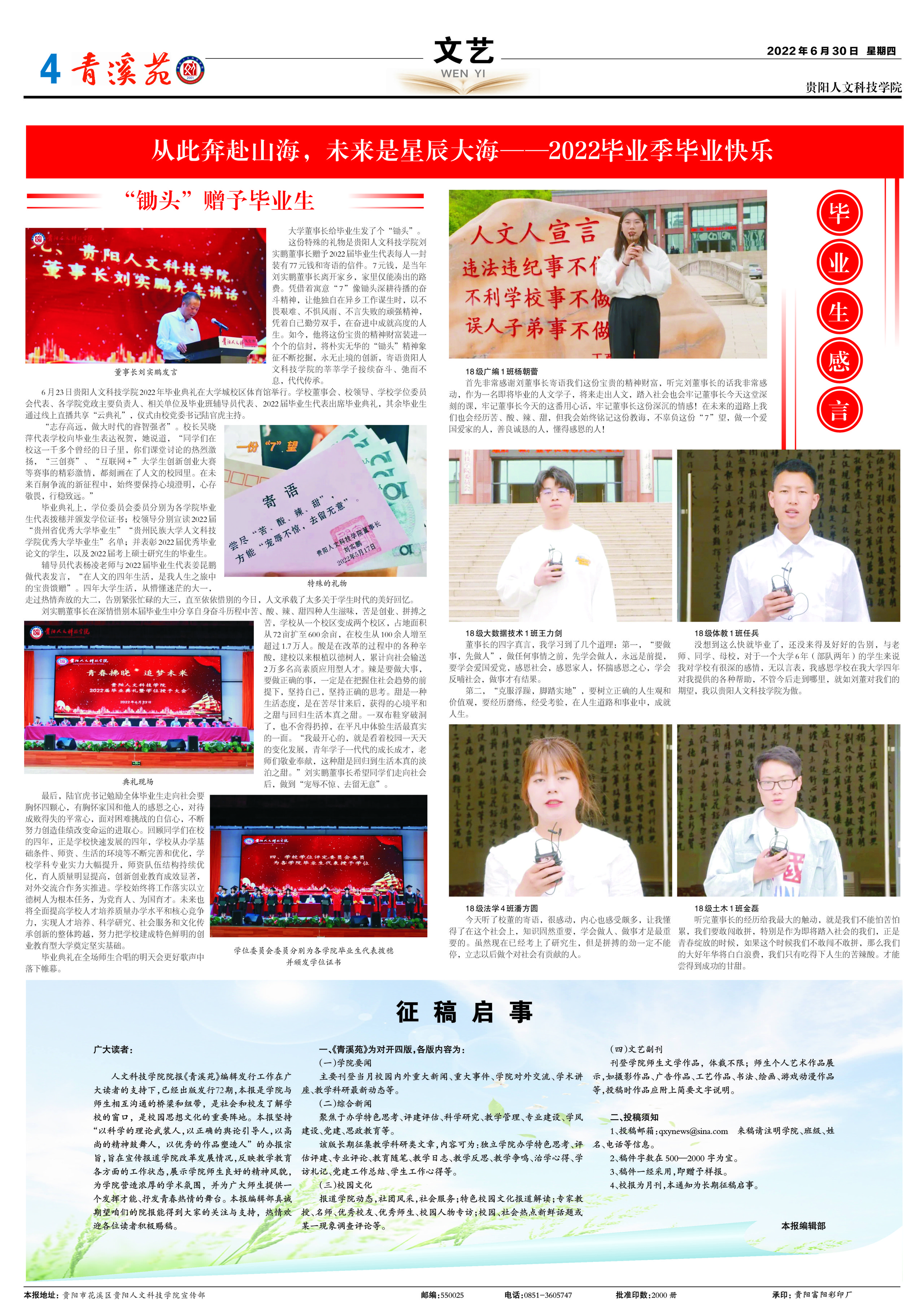来稿请注明:学院、班级、姓名、电话等信息。稿件字数在500—4000字为宜,稿件一经采用,即赠予样报,校报为月刊,本报长期征稿。