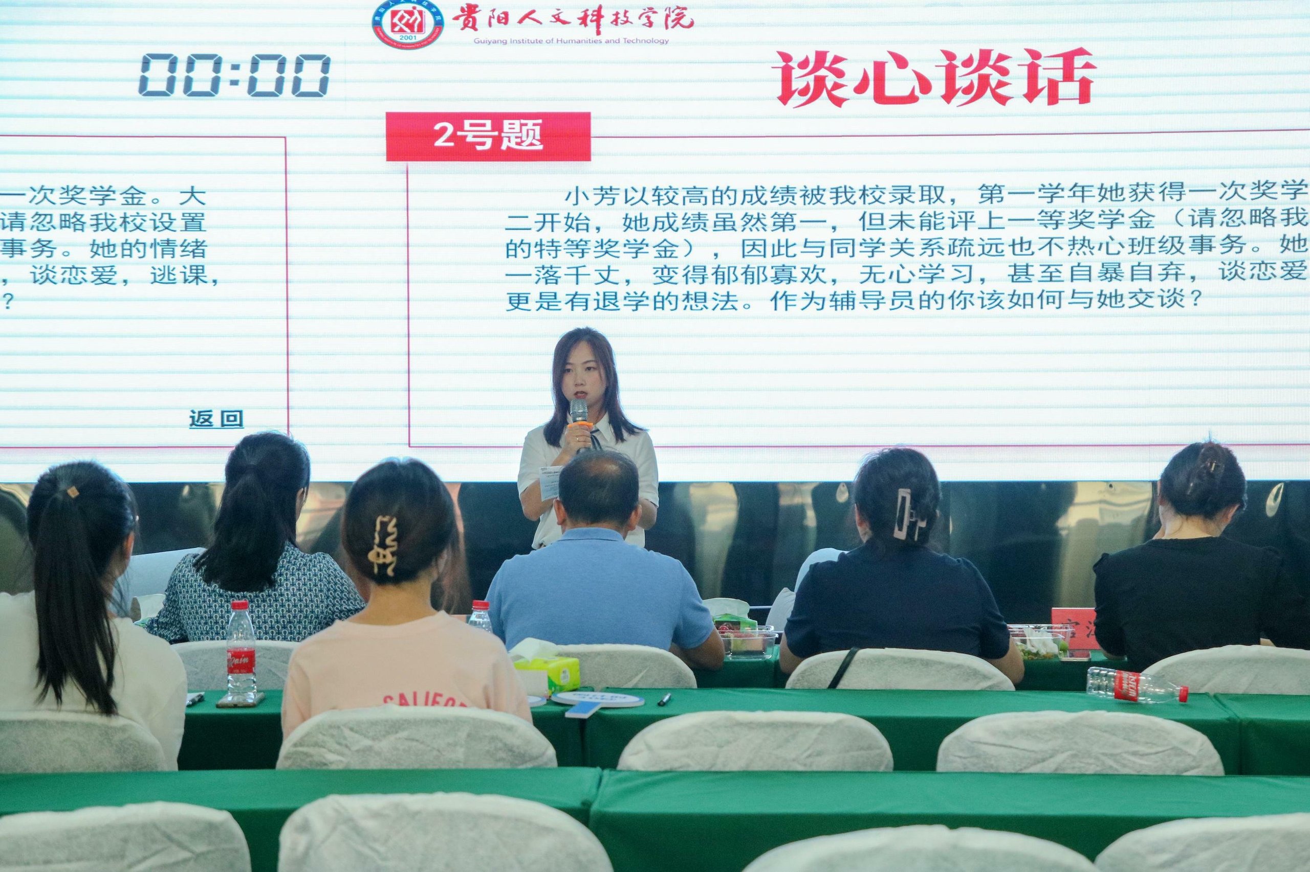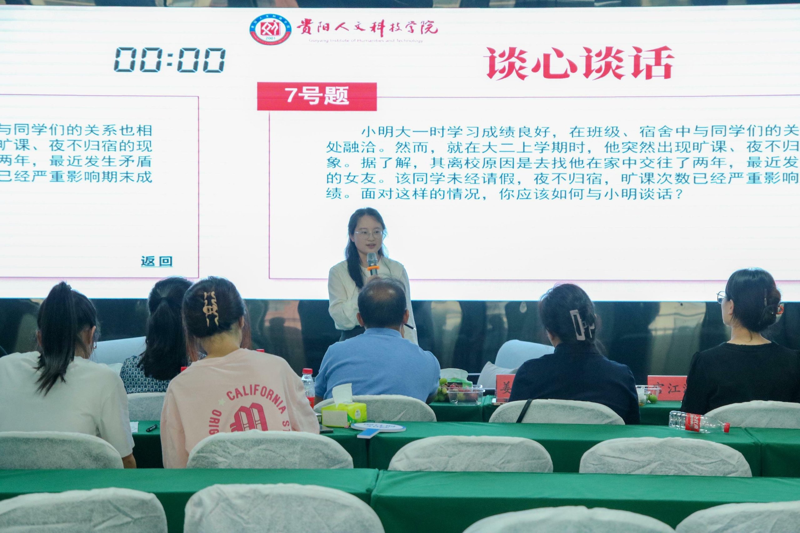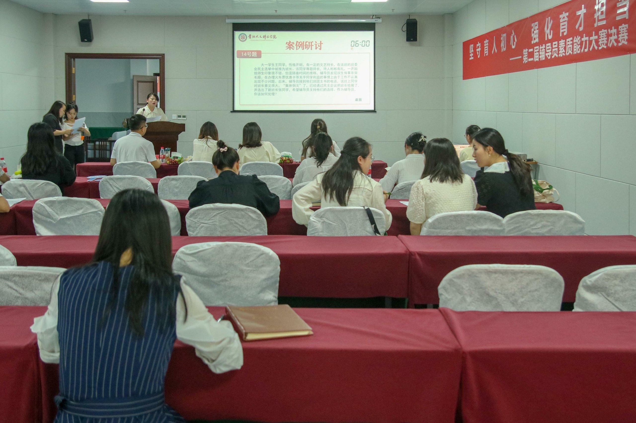 案例研讨环节主要考察辅导员综合运用理论分析问题、研判问题、解决问题的能力。选手在赛前10分钟抽取1道案例,围绕案例对问题的本质、解决思路、实施办法等进行分析总结。评委根据参赛选手的分析进行提问,选手回答。