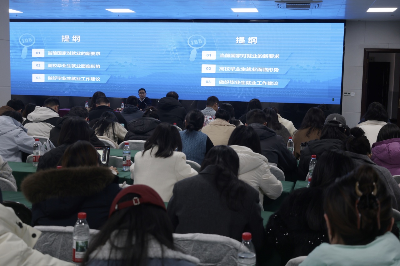 詹鑫科长以“全力拓岗优服务,聚力克难促就业”为主题,从“当前国家对就业的新要求”“高校毕业生就业面临形势”“做好毕业生就业工作建议”三方面进行细致讲解。