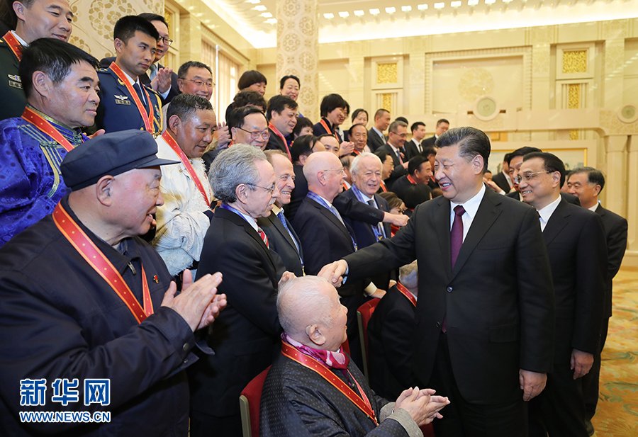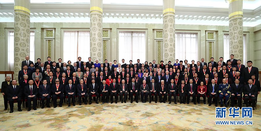 在《春天的故事》乐曲声中,习近平等为获得改革先锋称号、中国改革友谊奖章人员代表颁奖。