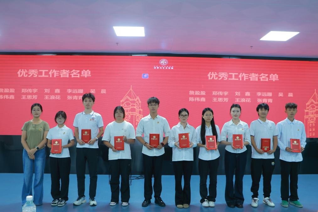 为进一步夯实学院团学工作基础,强化学生组织建设效能,10月14日,体育与艺术学院隆重举行团委、学生会换届表彰大会。学院党委副书记邓程民、团委书记张鸿雁、学生第一党支部书记杨宋妹、学生第二党支部书记吴宗敏出席大会,学院团委、学生会新老成员及兄弟学院团委、学生会代表共同参会。本次大会通过复盘过往工作、表彰先进典型、选拔新任骨干,为学院学生工作注入全新活力,助力学生组织建设水平再攀新高。